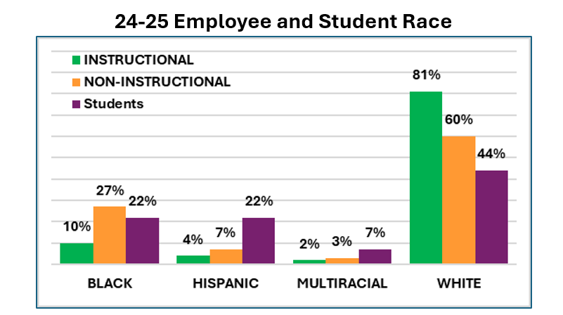 Note: Instructional employees are Unit 1 positions. Non-Instructional Employees are Units 2-6 positions. Staff Data is as of 10.15.24. Student data is as of 9.30.24. Groups ≥ 5% of the student population are displayed. ⬆, ⬇, ↔ indicates change from 23-24 to 24-25. Next Update: November 2025.